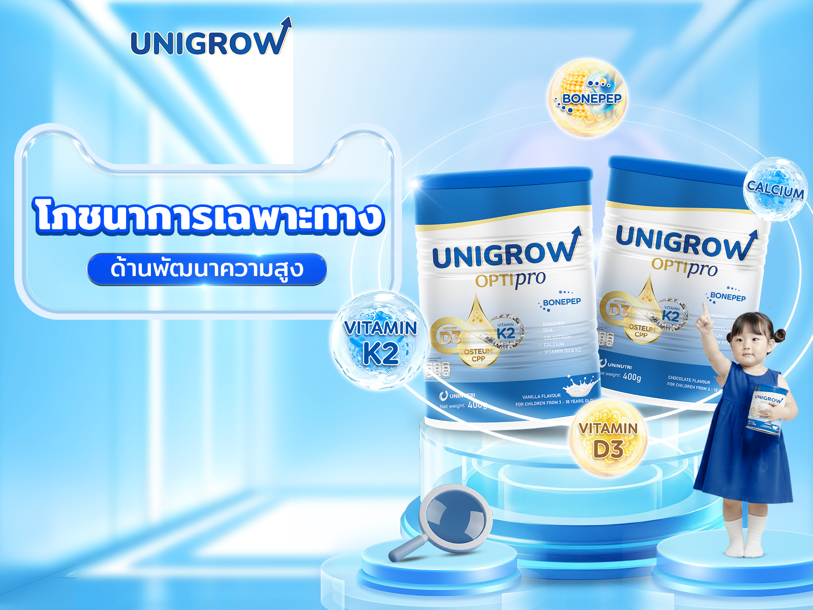 สำหรับคุณพ่อคุณแม่ การปรับสมดุลสารอาหารทั้งหมดข้างต้นผ่านมื้ออาหารประจำวันสำหรับลูกอาจเป็นเรื่องยาก Unigrow นำเสนอโซลูชั่นโภชนาการใหม่ชื่อ Unigrow Optipro ซึ่งได้รับการวิจัยเพื่อสนับสนุนการพัฒนาที่ครอบคลุมของเด็ก ผลิตภัณฑ์นี้มุ่งเน้นการจัดหาส่วนประกอบที่จำเป็นสำหรับการพัฒนาความสูง